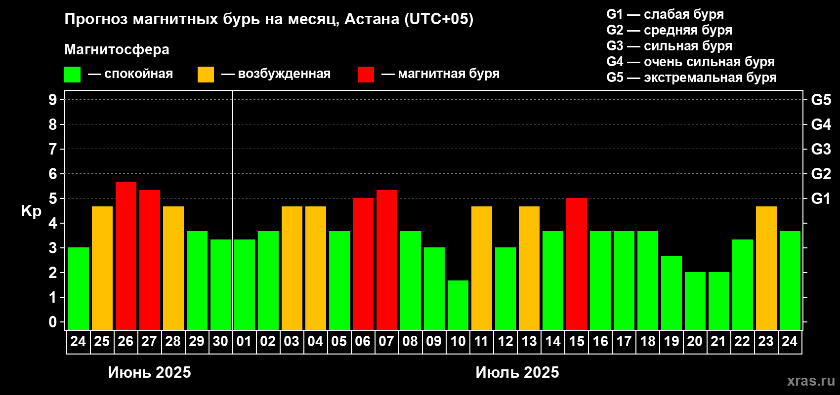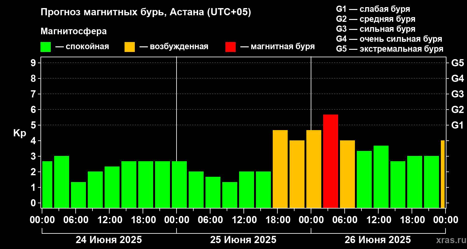 Прогноз магнитных бурь в Астане на 24 июня 2025 года