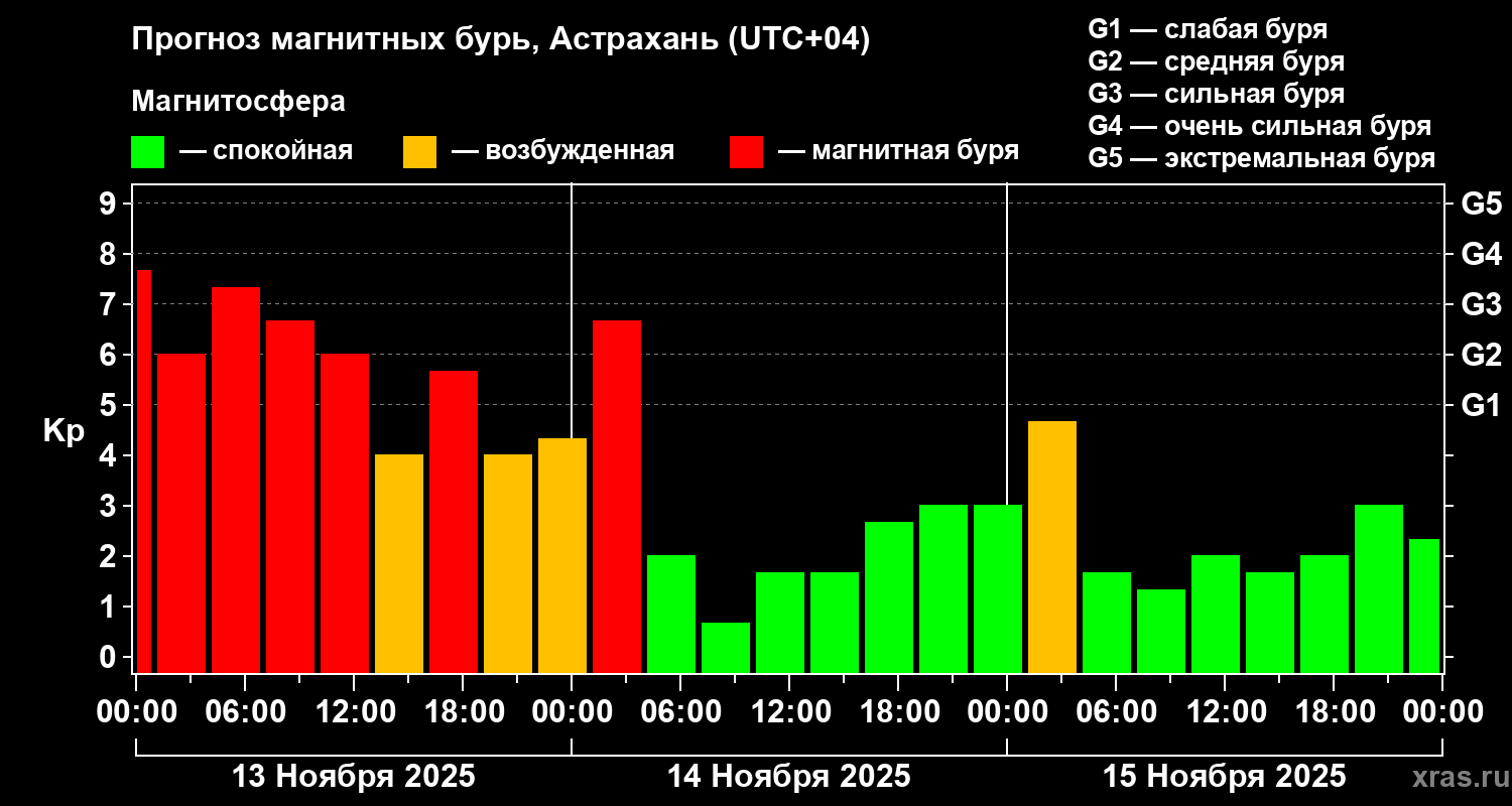 Прогноз магнитных бурь Астрахани на 13 ноября 2025 года