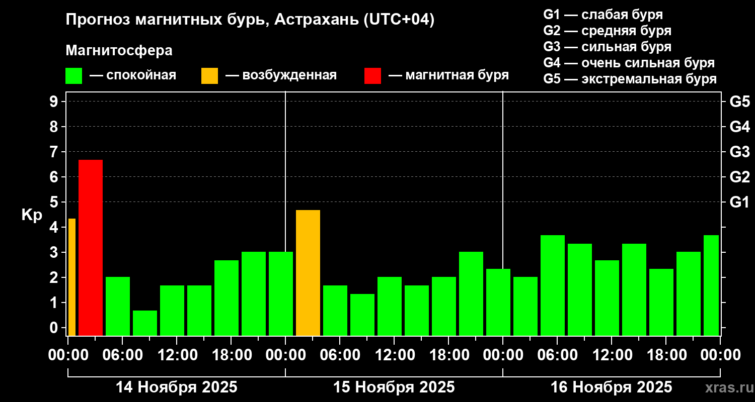 Прогноз магнитных бурь Астрахани — 14 ноября 2025 года