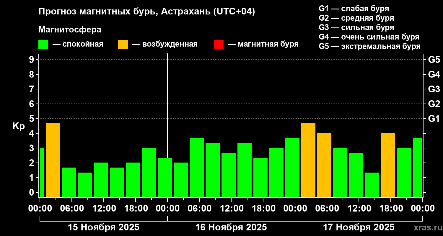 Прогноз магнитных бурь Астрахани — 15 ноября 2025 года