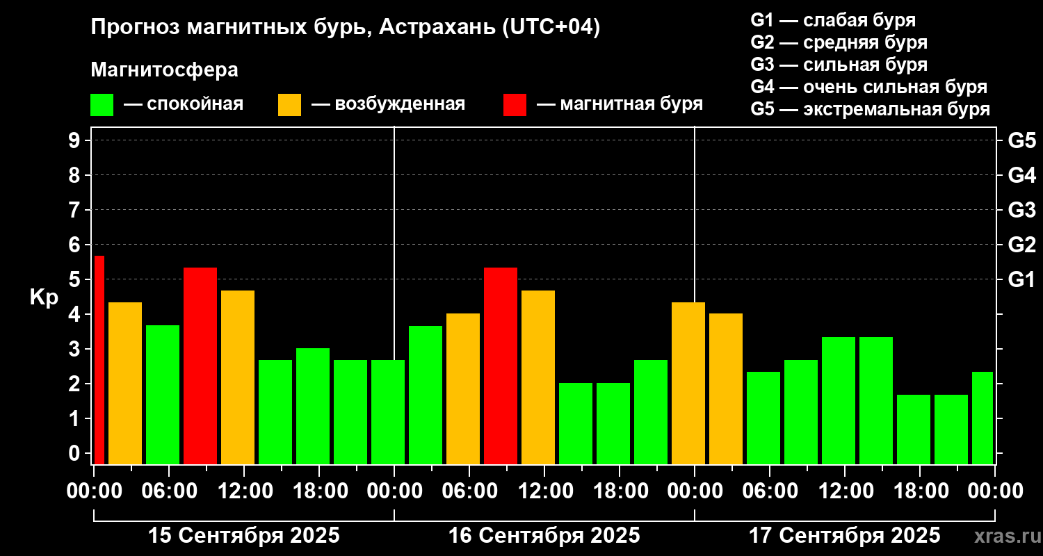 Прогноз магнитных бурь Астрахани на 15 сентября 2025 года