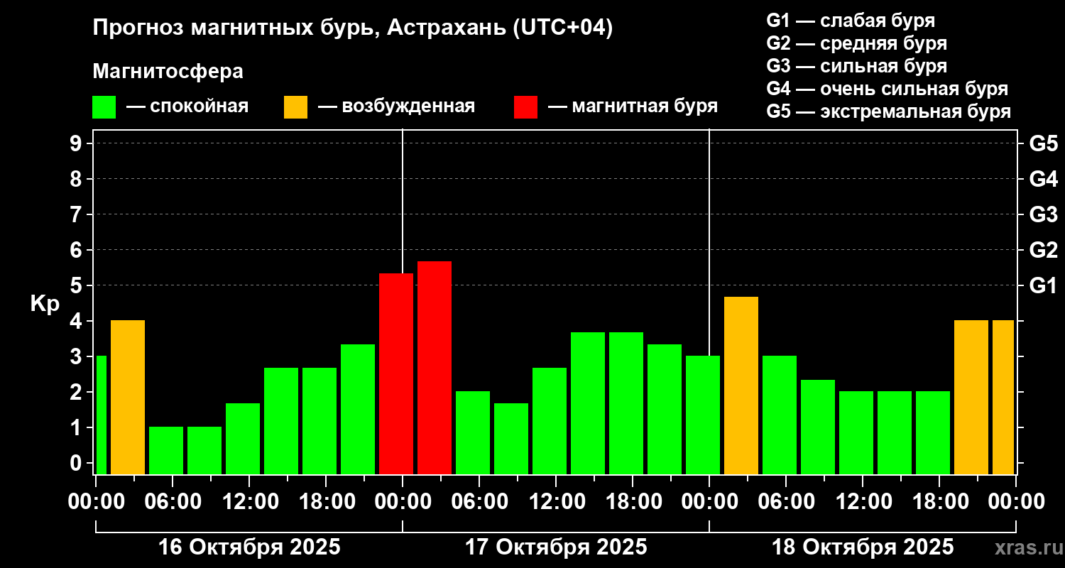 Прогноз магнитных бурь Астрахани на 16 октября 2025 года