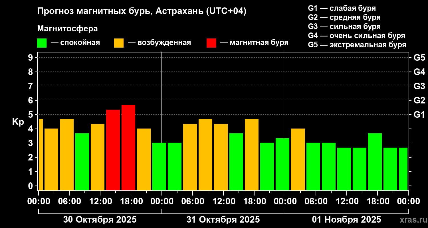 Прогноз магнитных бурь Астрахани на 30 октября 2025 года