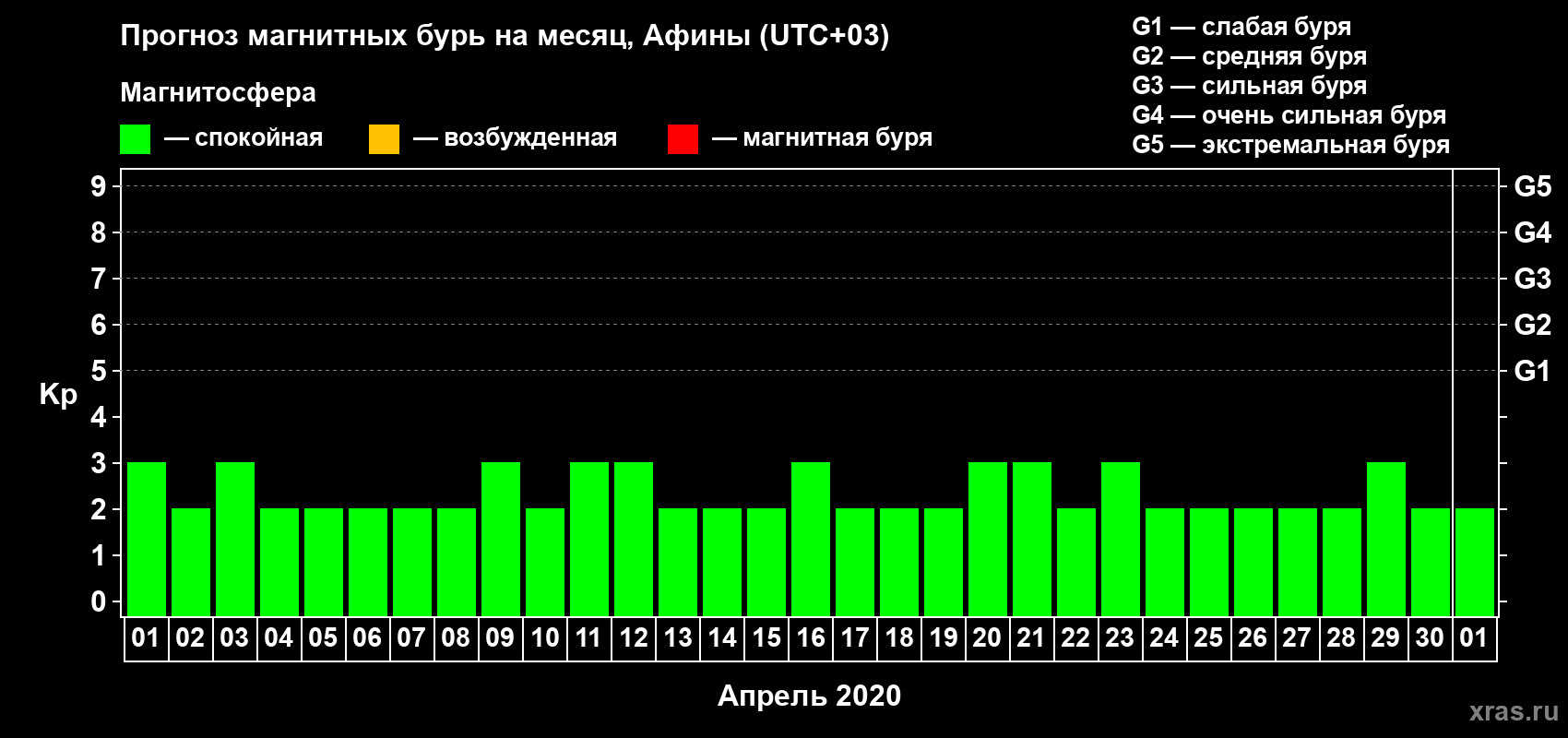 Прогноз магнитных бурь Афинах — 1 апреля 2020 года