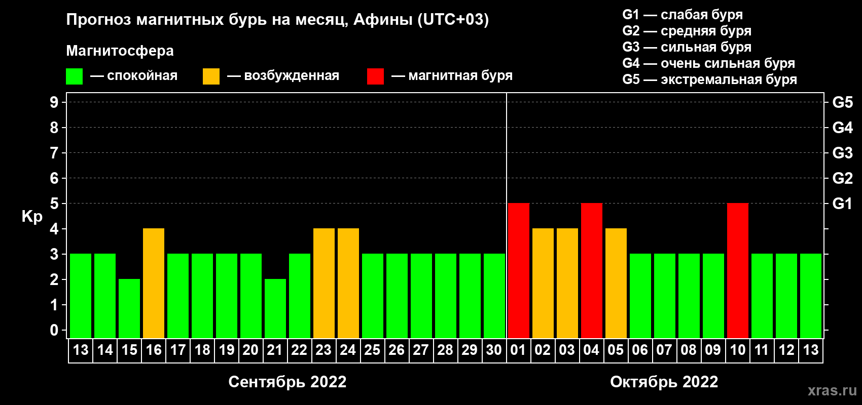 Прогноз магнитных бурь Афинах — 13 сентября 2022 года
