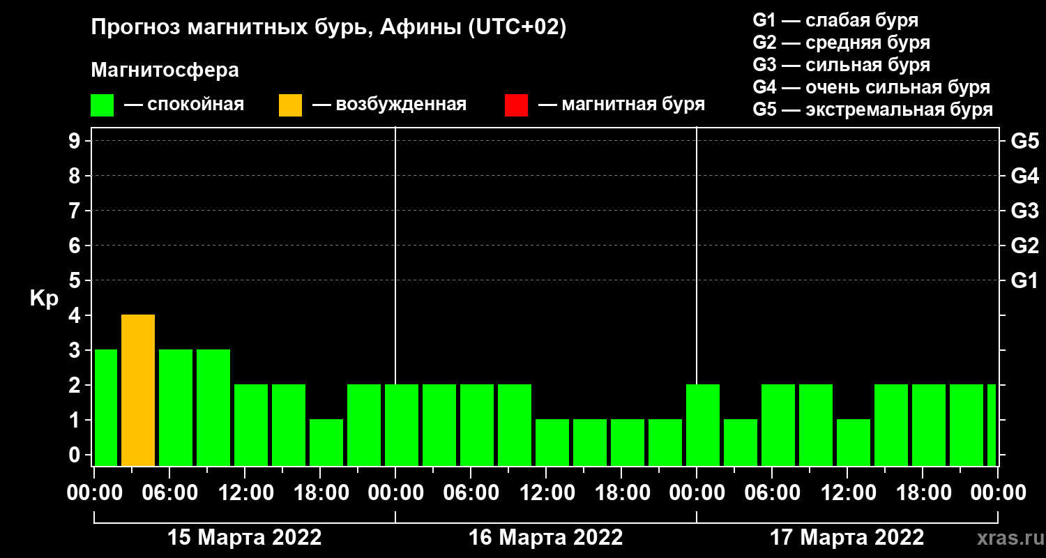 Прогноз магнитных бурь Афинах — 15 марта 2022 года
