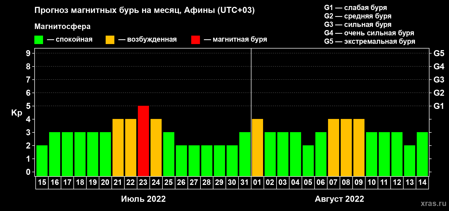 Прогноз магнитных бурь Афинах — 15 июля 2022 года