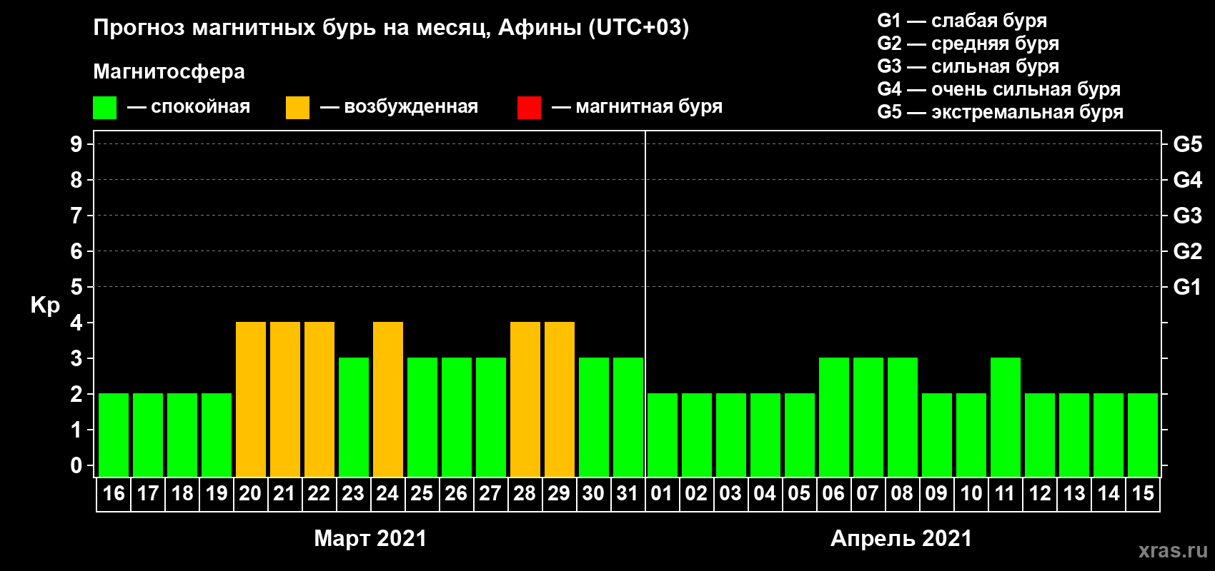 Прогноз магнитных бурь Афинах — 16 марта 2021 года