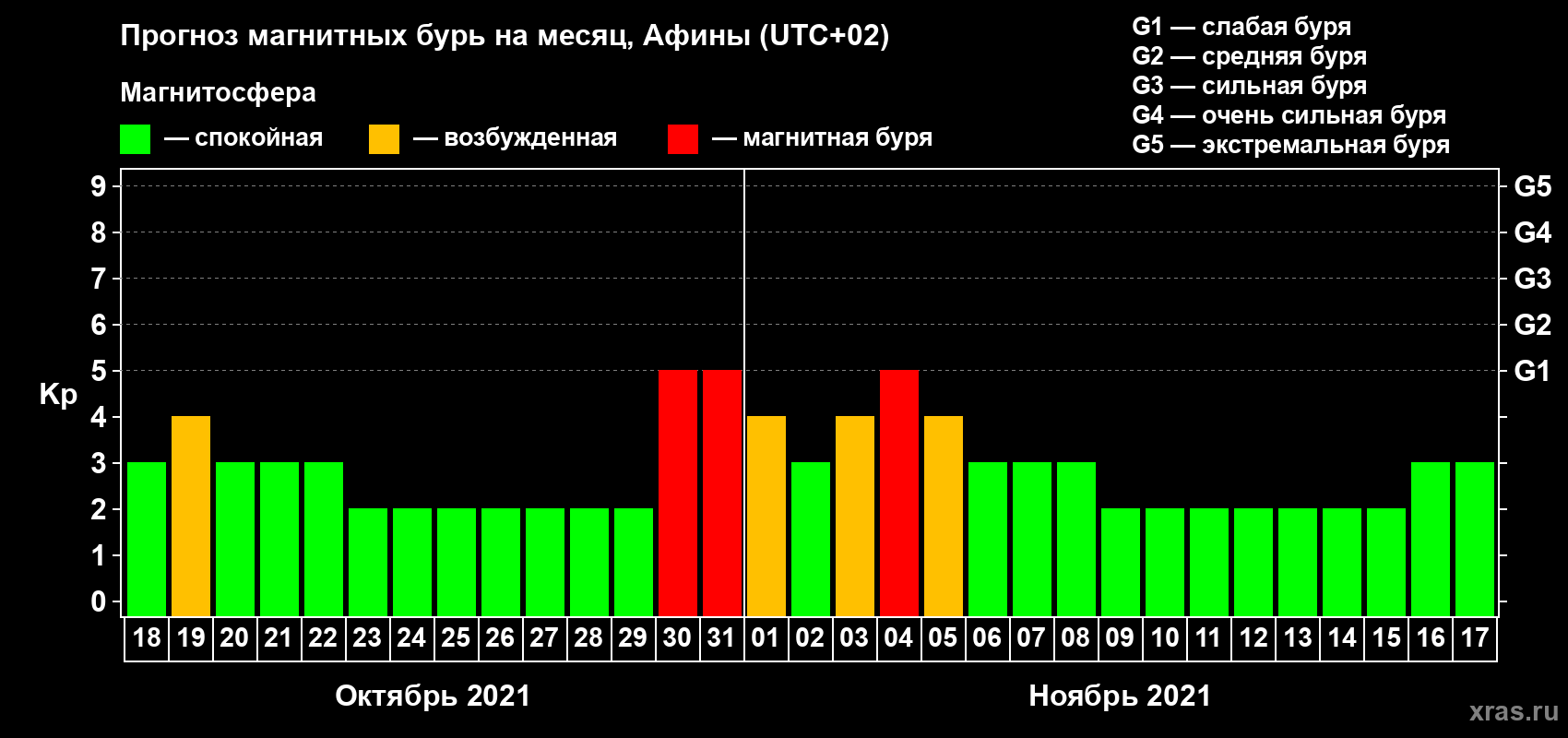 Прогноз магнитных бурь Афинах — 18 октября 2021 года