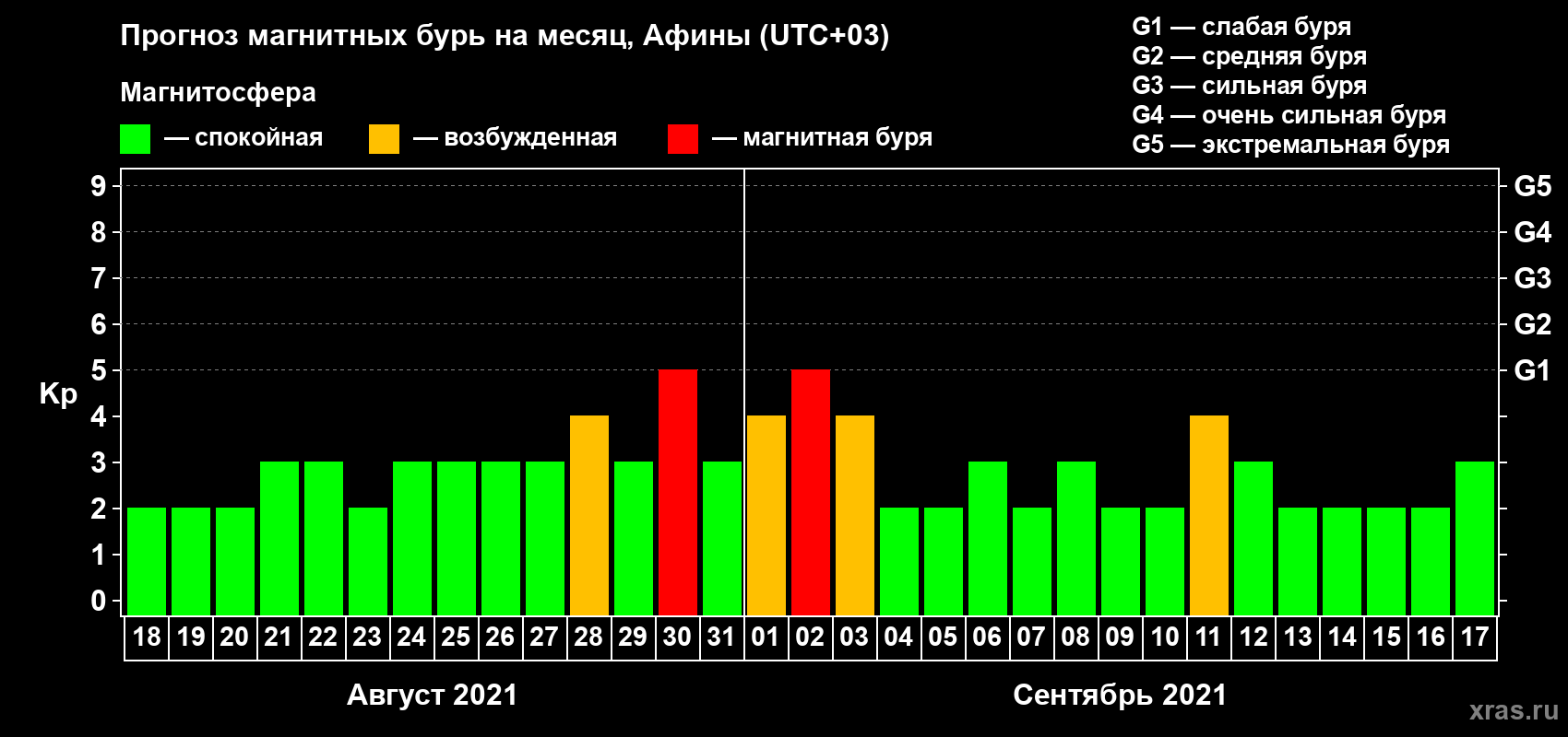 Прогноз магнитных бурь Афинах — 18 августа 2021 года