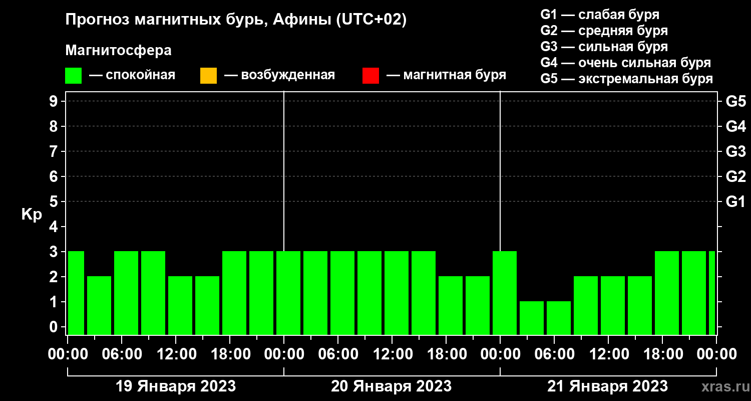 Прогноз магнитных бурь Афинах — 19 января 2023 года