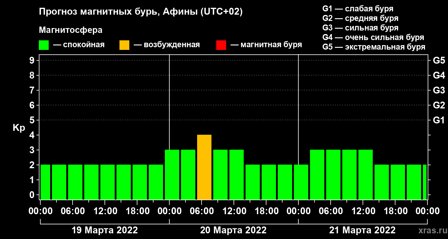 Прогноз магнитных бурь Афинах — 19 марта 2022 года