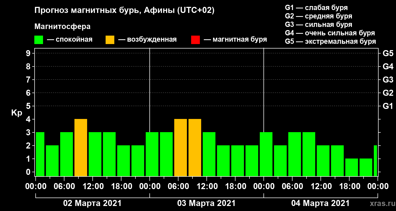 Прогноз магнитных бурь Афинах — 2 марта 2021 года