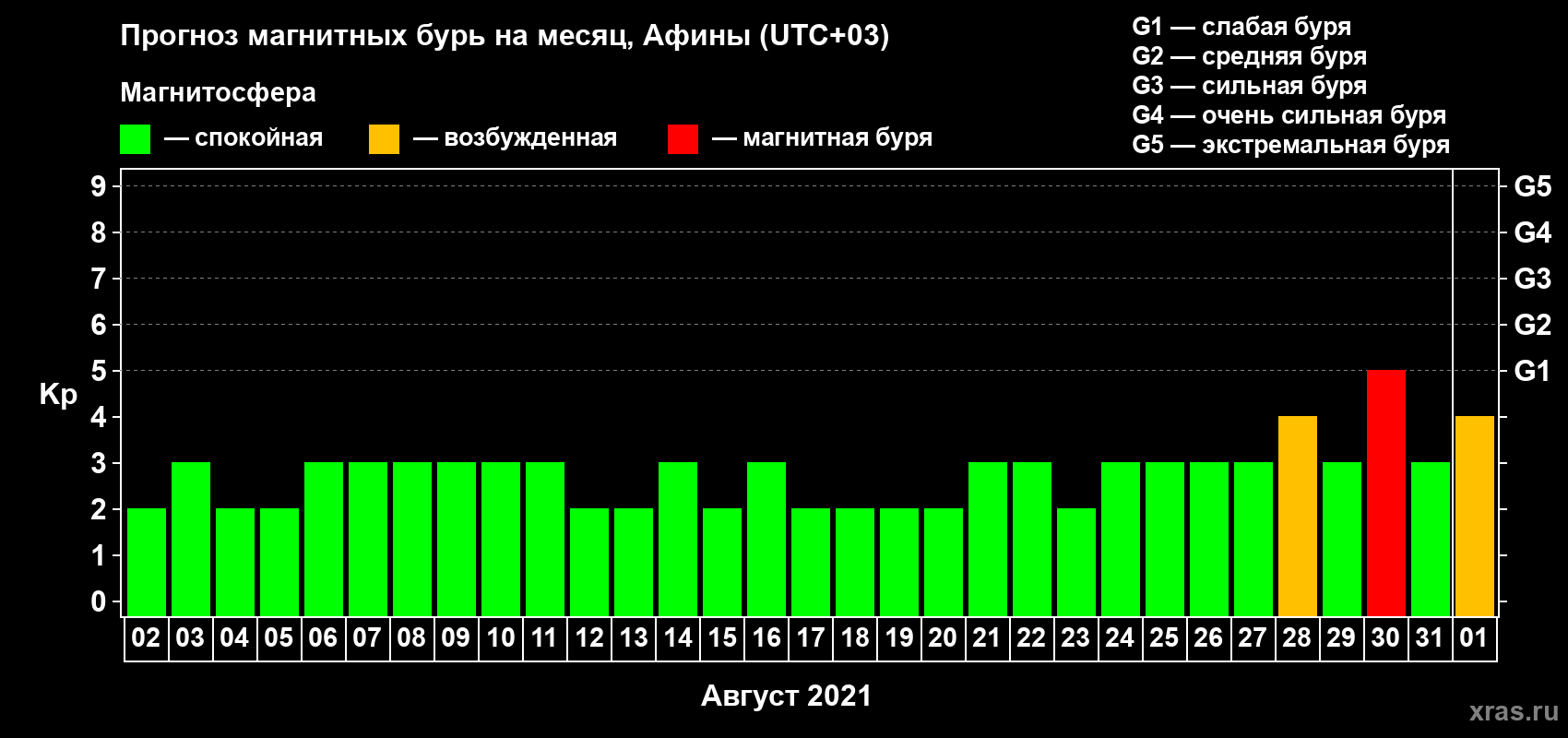 Прогноз магнитных бурь Афинах — 2 августа 2021 года