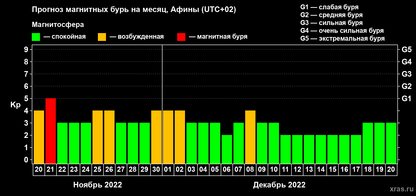 Прогноз магнитных бурь Афинах — 20 ноября 2022 года