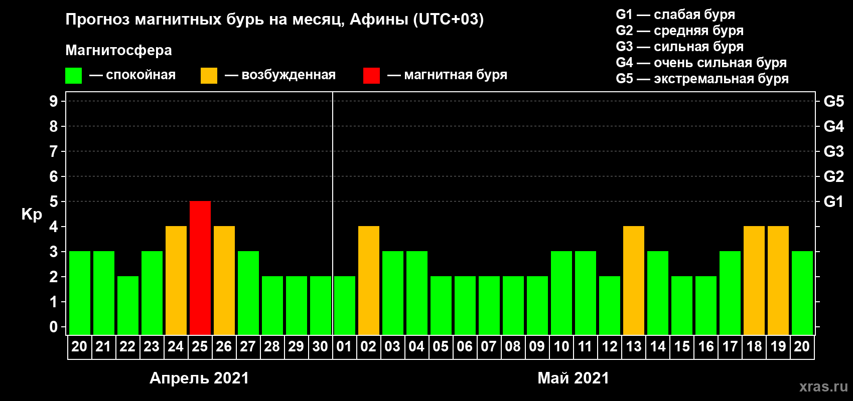 Прогноз магнитных бурь Афинах — 20 апреля 2021 года