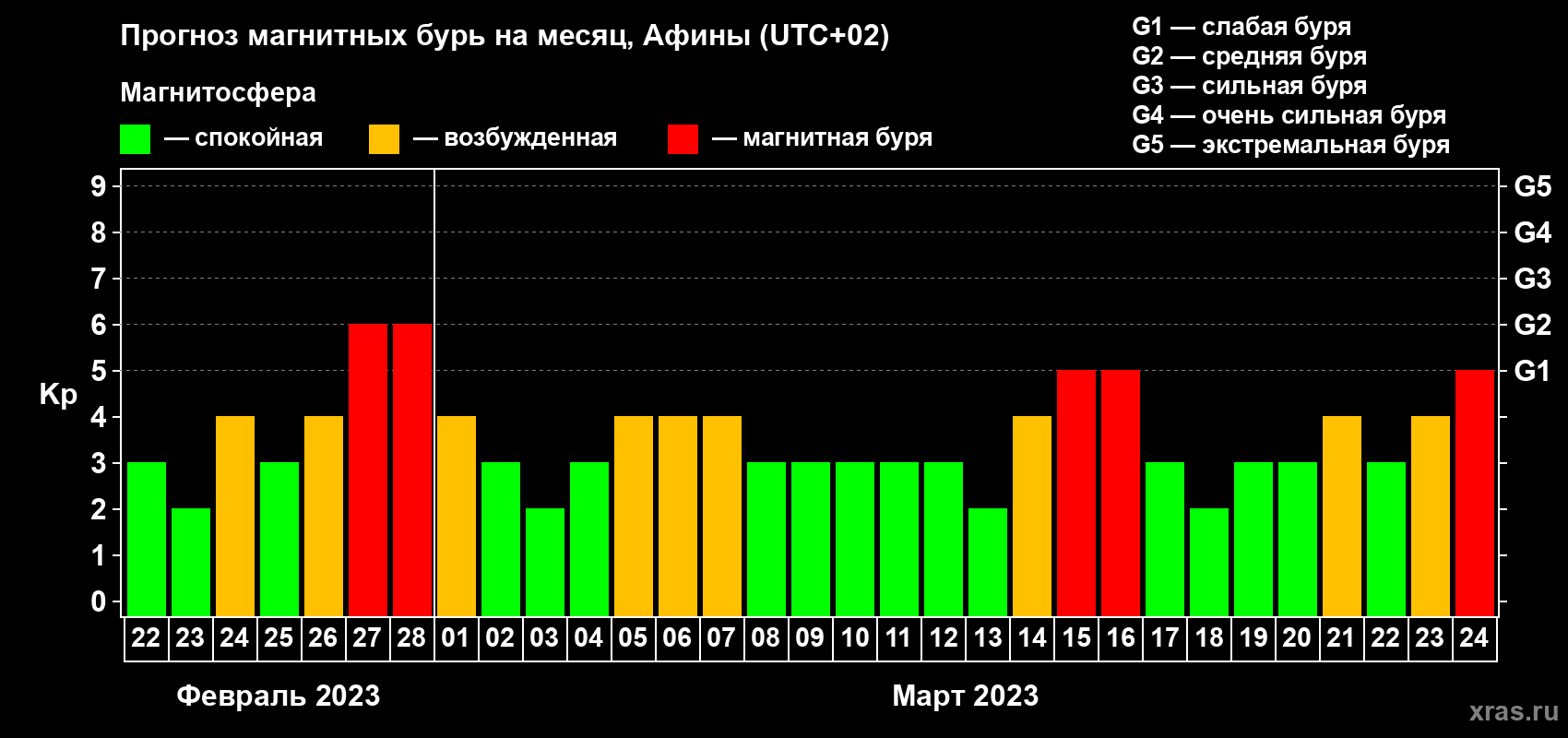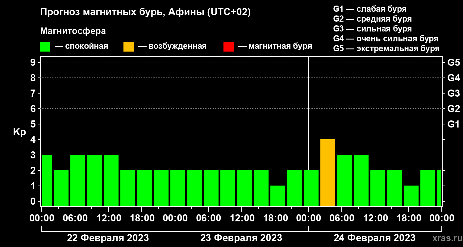 Прогноз магнитных бурь Афинах — 22 февраля 2023 года
