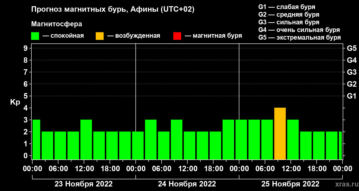 Прогноз магнитных бурь Афинах — 23 ноября 2022 года