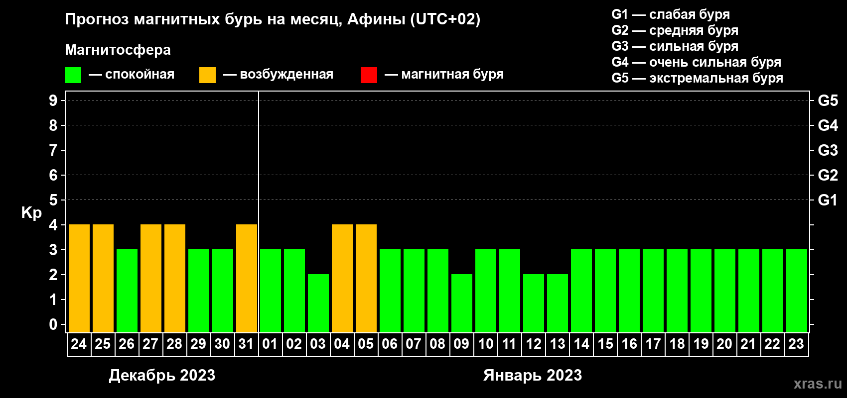Прогноз магнитных бурь Афинах — 24 декабря 2022 года