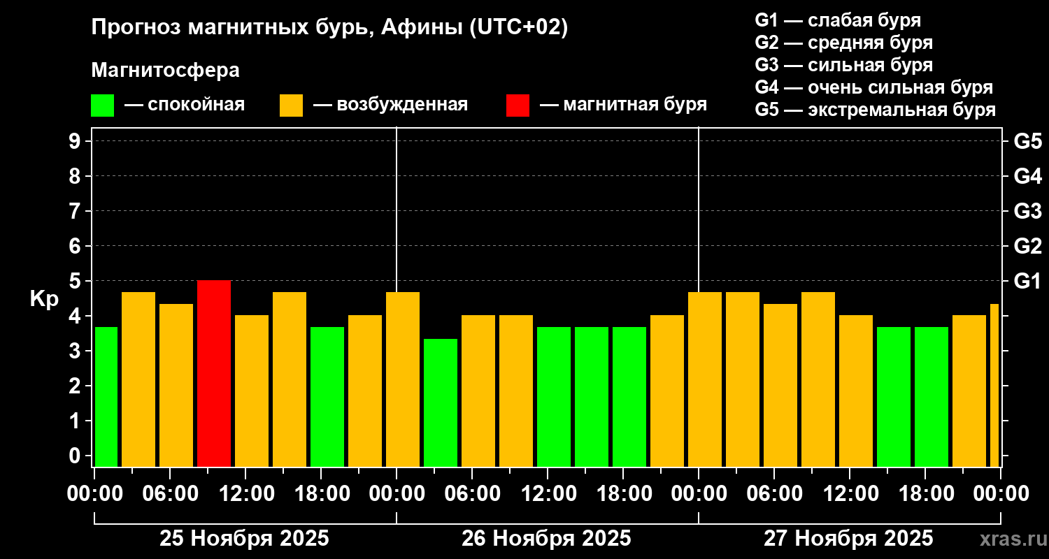 Прогноз магнитных бурь Афинах — 25 ноября 2025 года