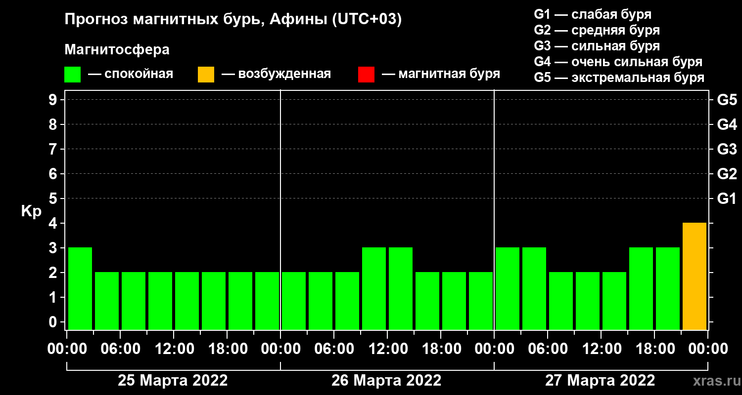 Прогноз магнитных бурь Афинах — 25 марта 2022 года