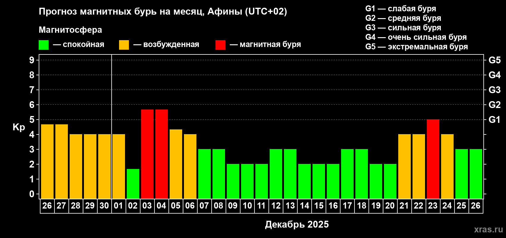 Прогноз магнитных бурь Афинах — 26 ноября 2025 года