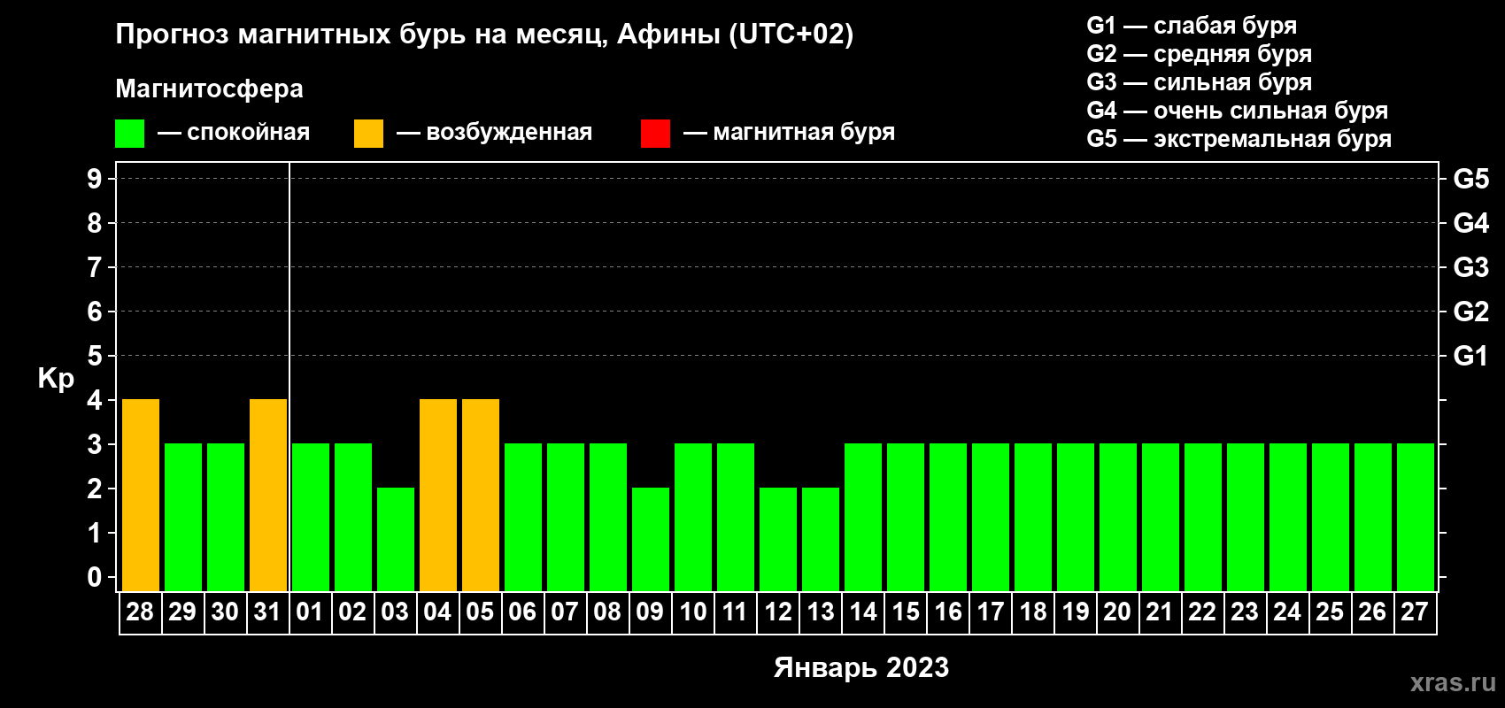 Прогноз магнитных бурь Афинах — 28 декабря 2022 года