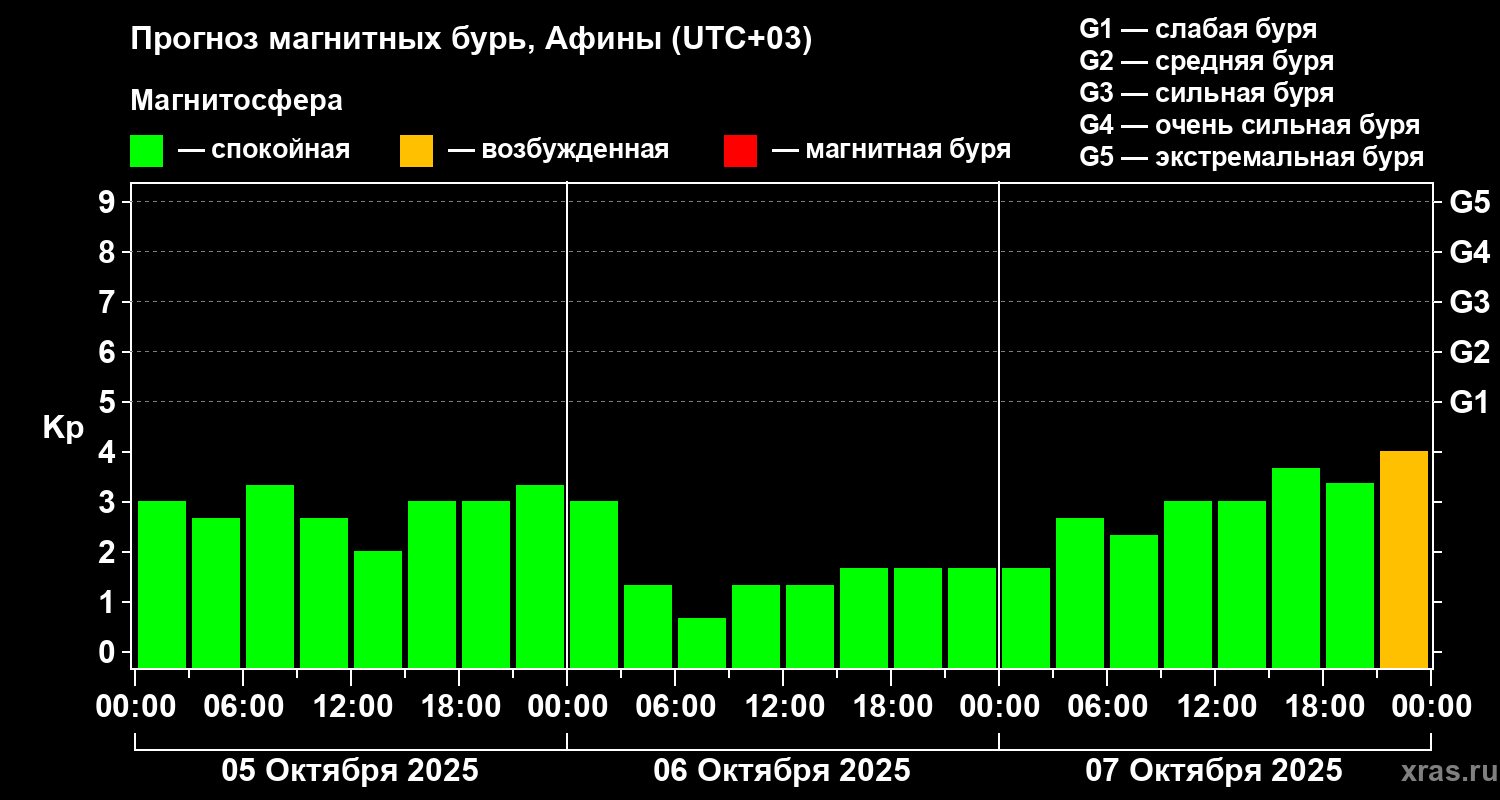 Прогноз магнитных бурь Афинах — 5 октября 2025 года