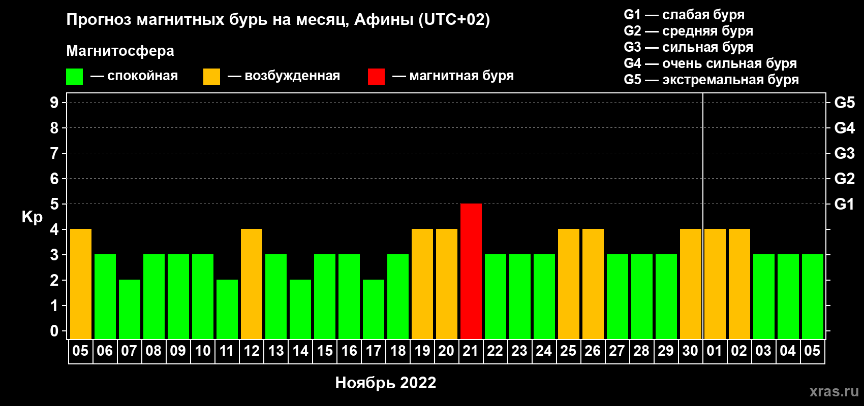 Прогноз магнитных бурь Афинах — 5 ноября 2022 года