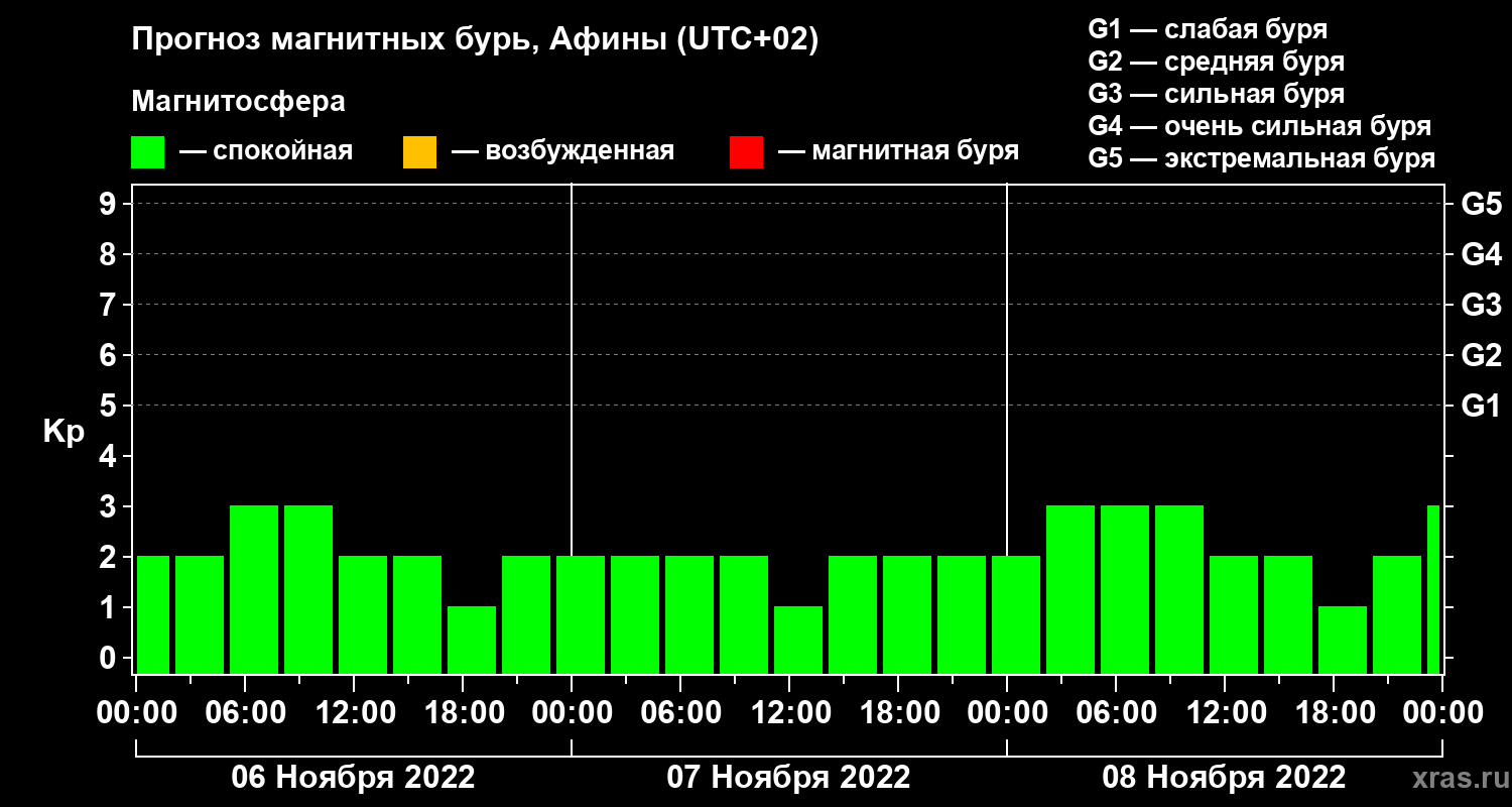 Прогноз магнитных бурь Афинах — 6 ноября 2022 года