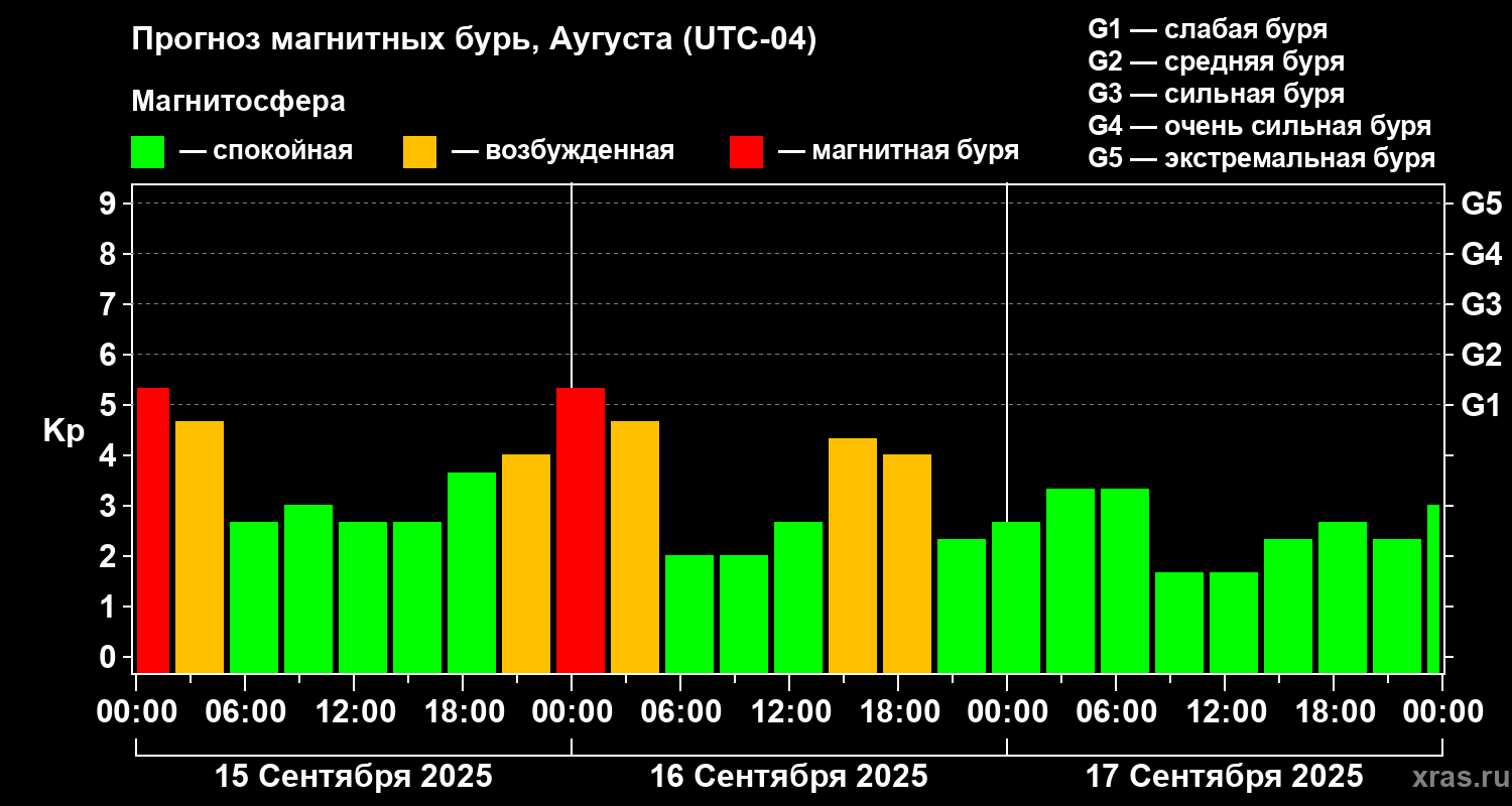 Прогноз магнитных бурь в Аугусте — 15 сентября 2025 года