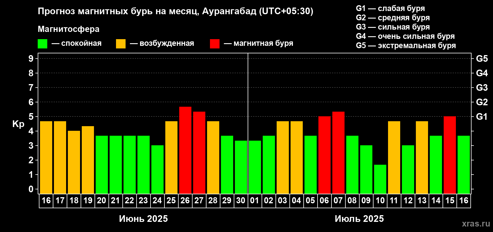 Прогноз магнитных бурь в Аурангабаде — 16 июня 2025 года
