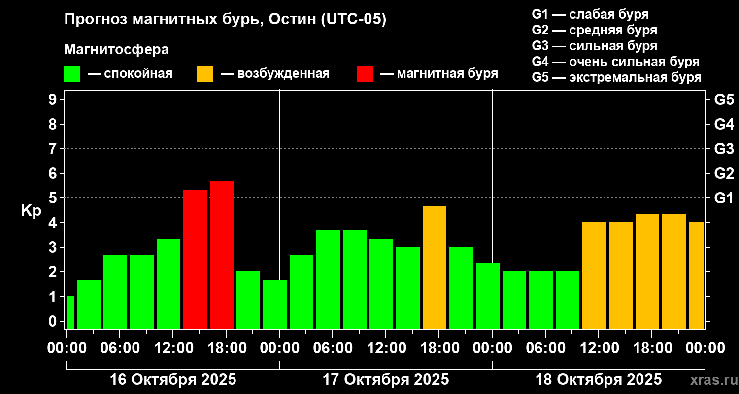 Прогноз магнитных бурь в Остине на 16 октября 2025 года