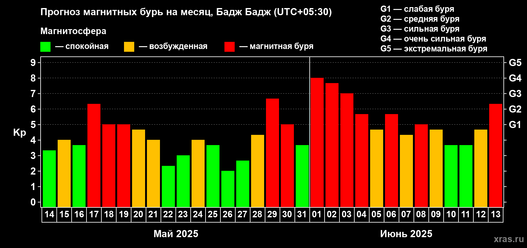 Прогноз магнитных бурь в Бадж Бадже на 14 мая 2025 года