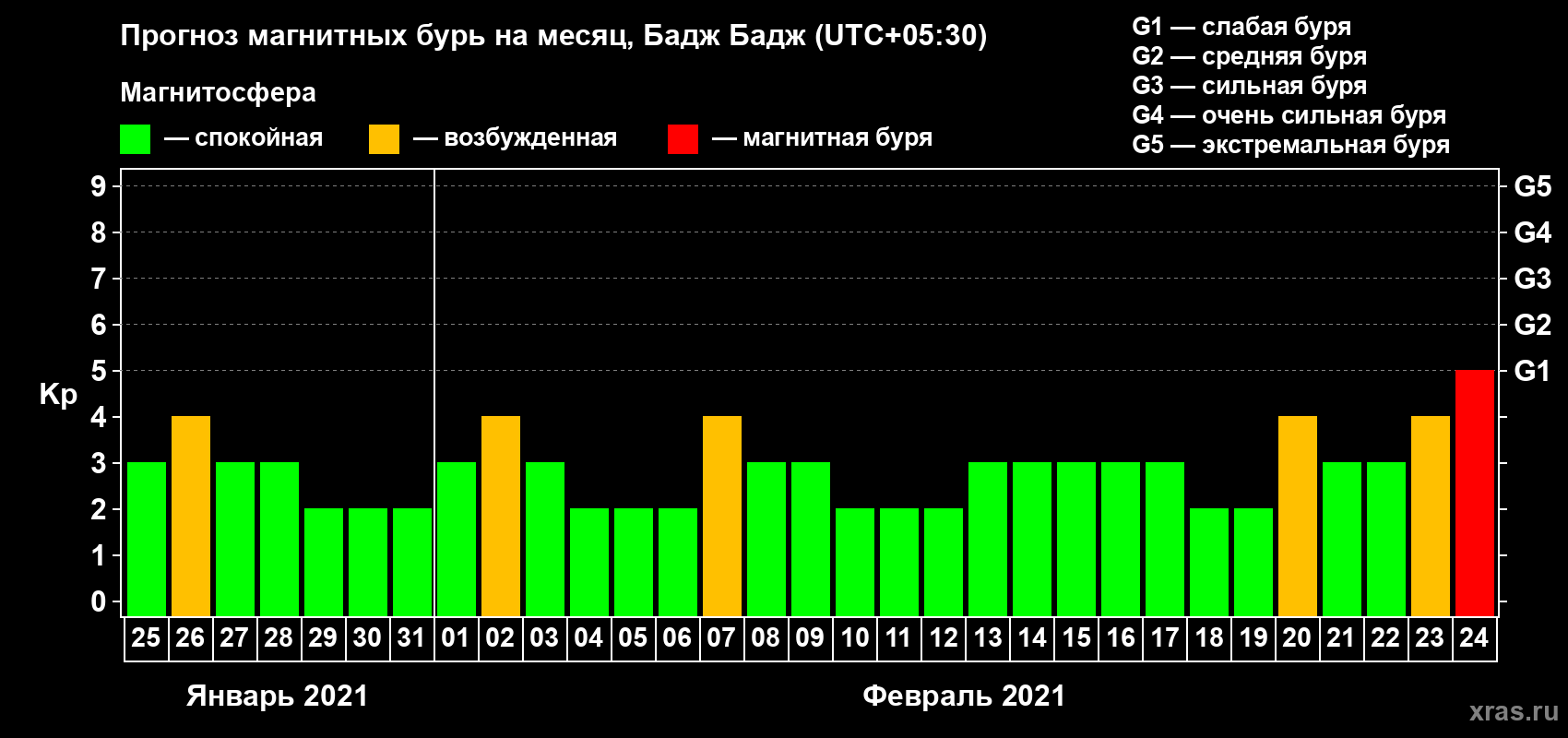 Прогноз магнитных бурь в Бадж Бадже — 25 января 2021 года