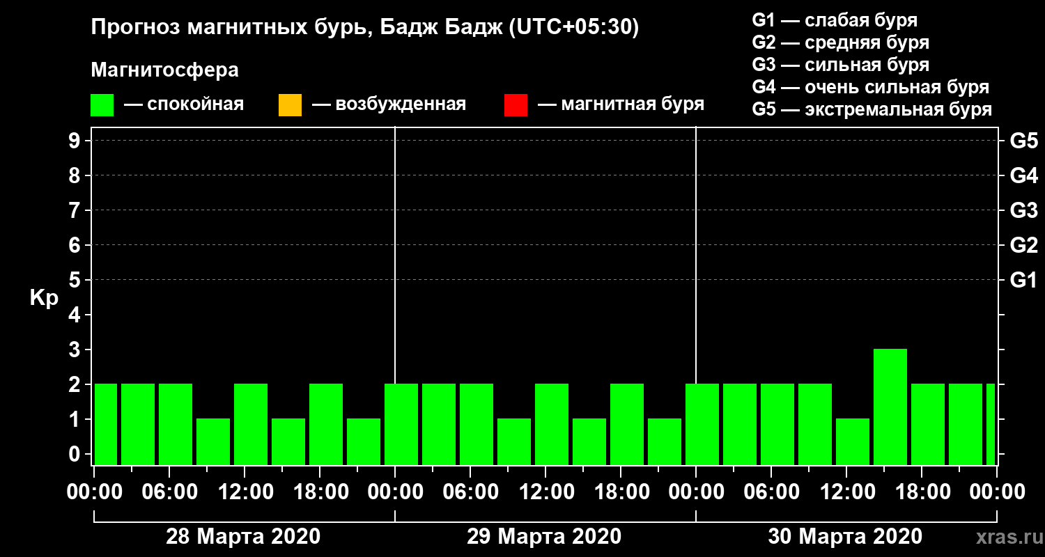 Прогноз магнитных бурь в Бадж Бадже на 28 марта 2020 года
