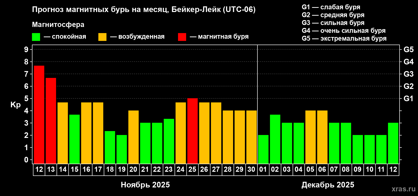 Прогноз магнитных бурь в Бейкер-Лейке — 12 ноября 2025 года