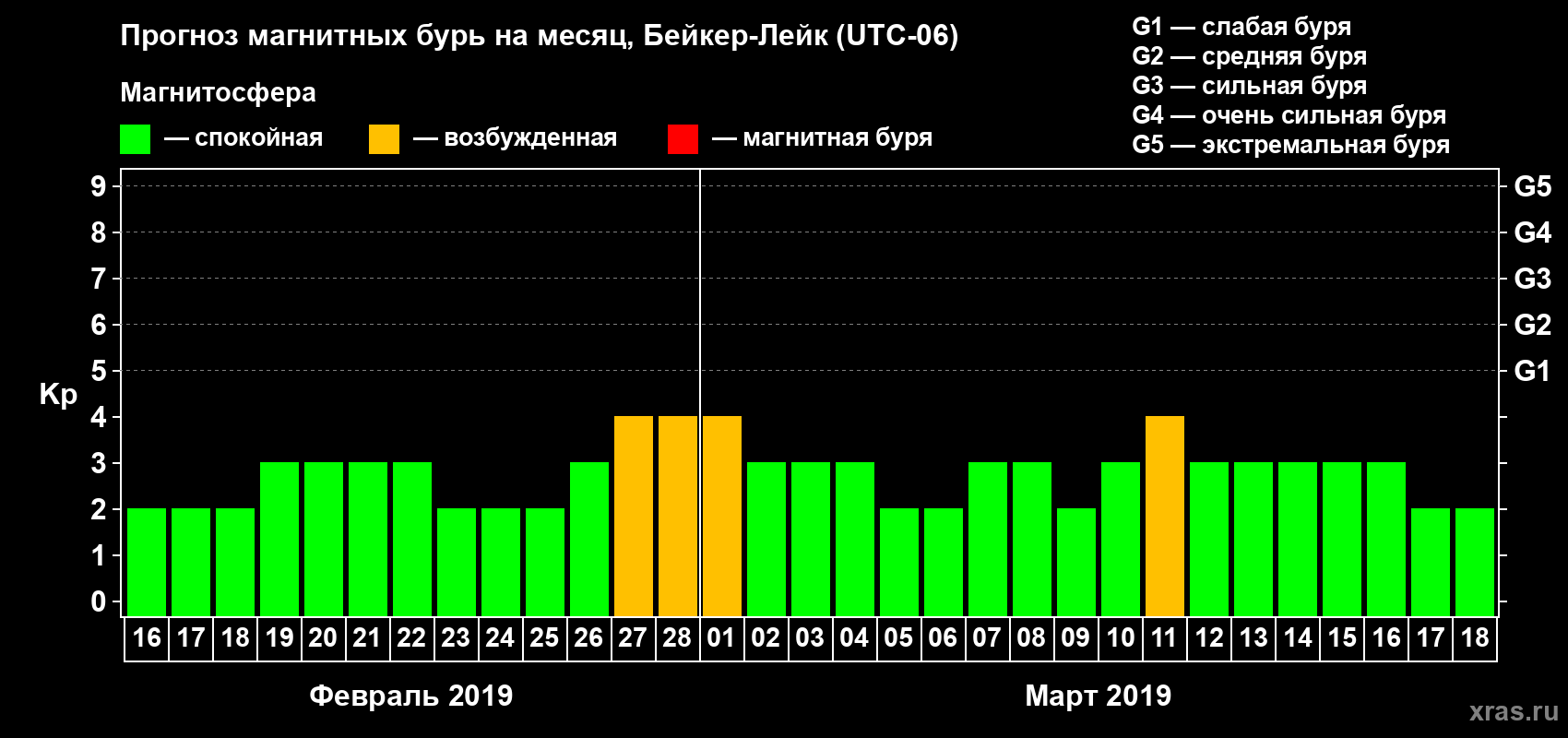 Прогноз магнитных бурь в Бейкер-Лейке — 16 февраля 2019 года