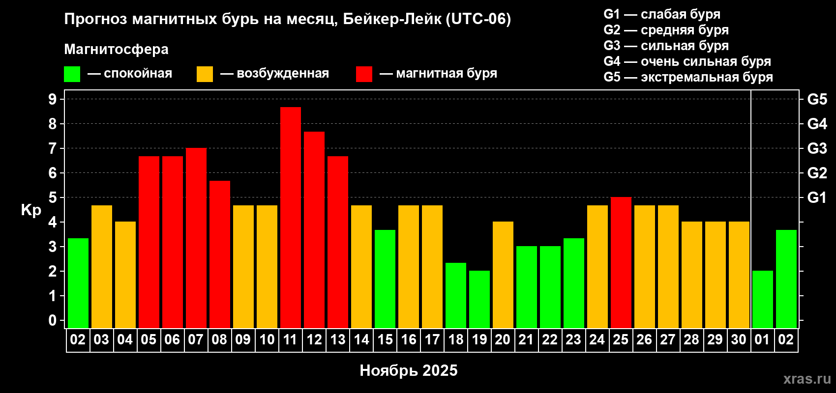 Прогноз магнитных бурь в Бейкер-Лейке — 2 ноября 2025 года
