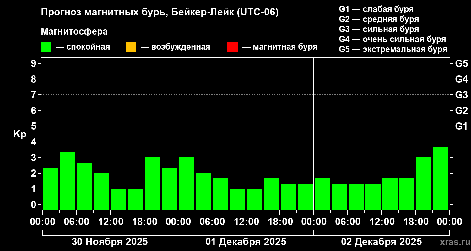 Прогноз магнитных бурь в Бейкер-Лейке — 30 ноября 2025 года