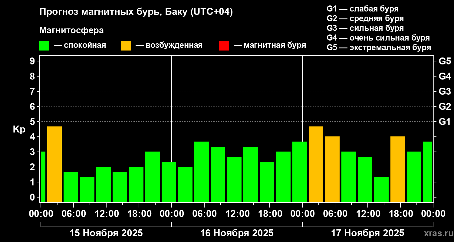 Прогноз магнитных бурь Баку — 15 ноября 2025 года