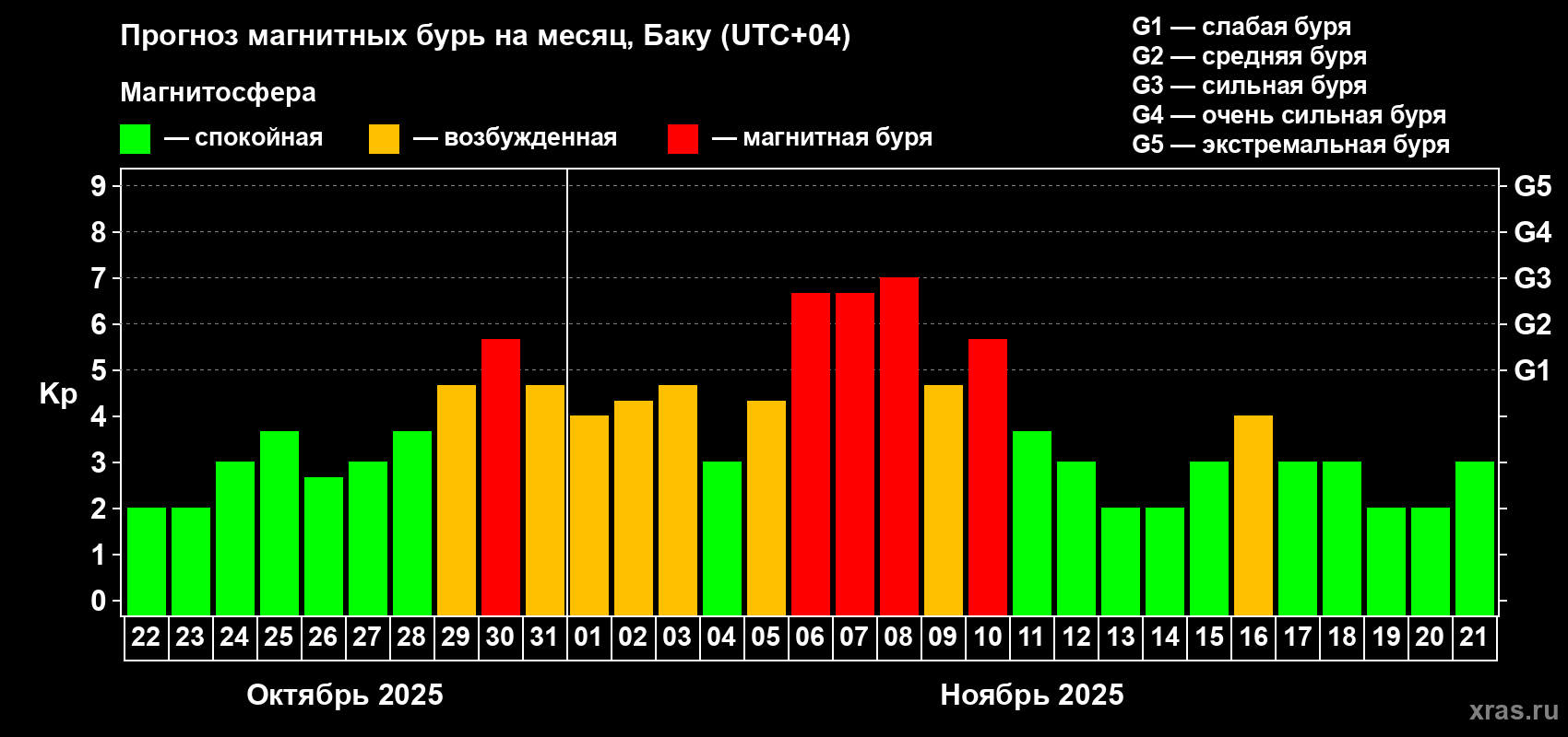 Прогноз магнитных бурь Баку — 22 октября 2025 года