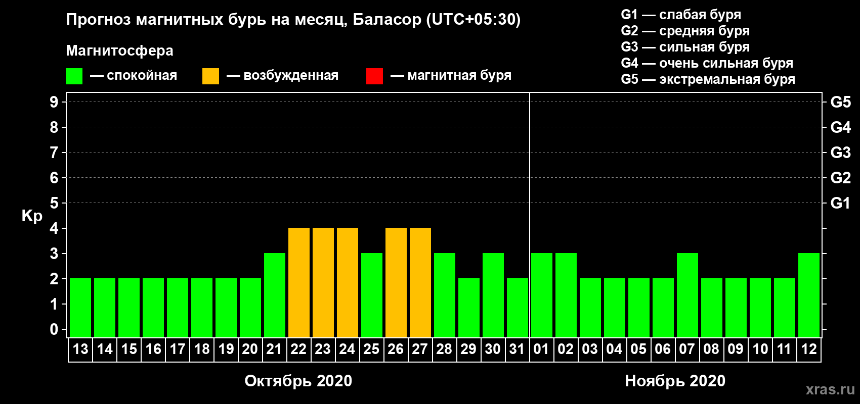 Прогноз магнитных бурь в Баласоре — 13 октября 2020 года