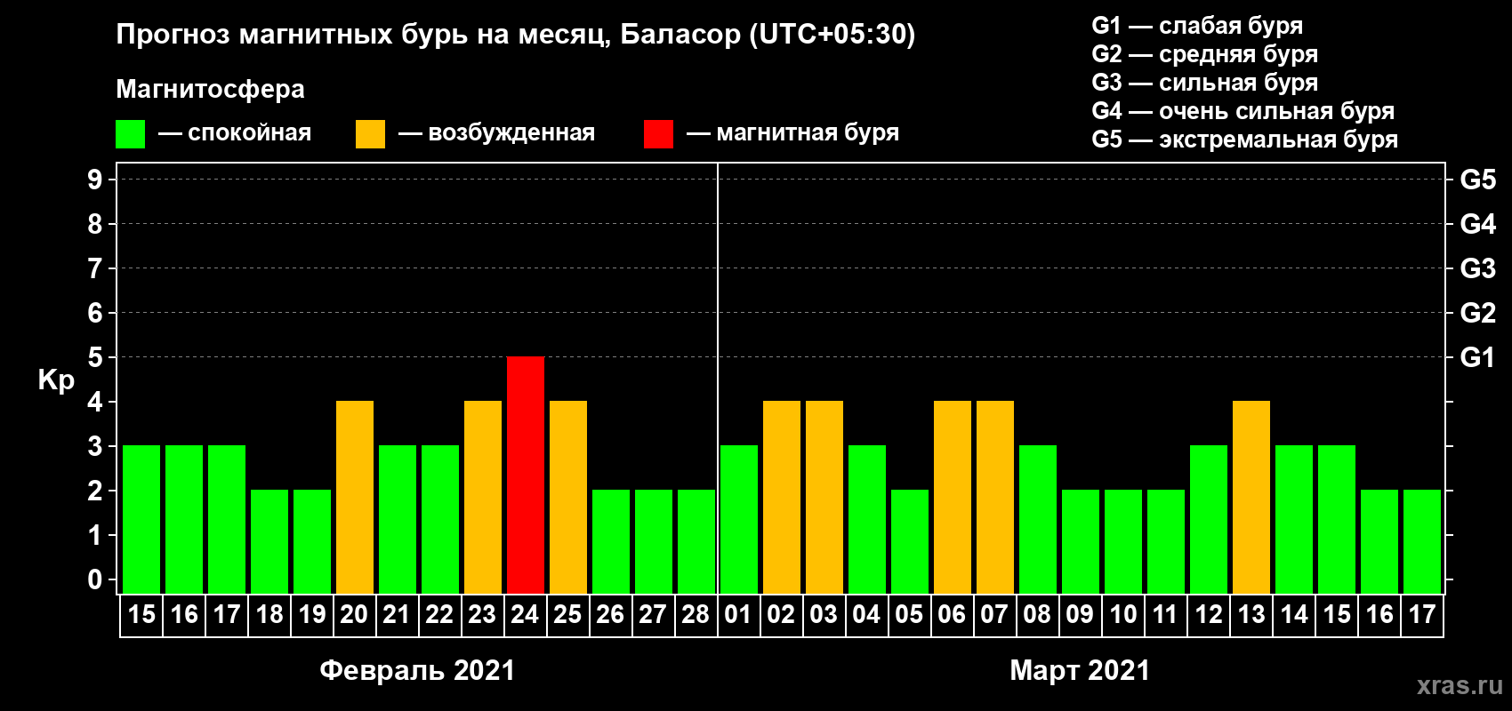 Прогноз магнитных бурь в Баласоре — 15 февраля 2021 года