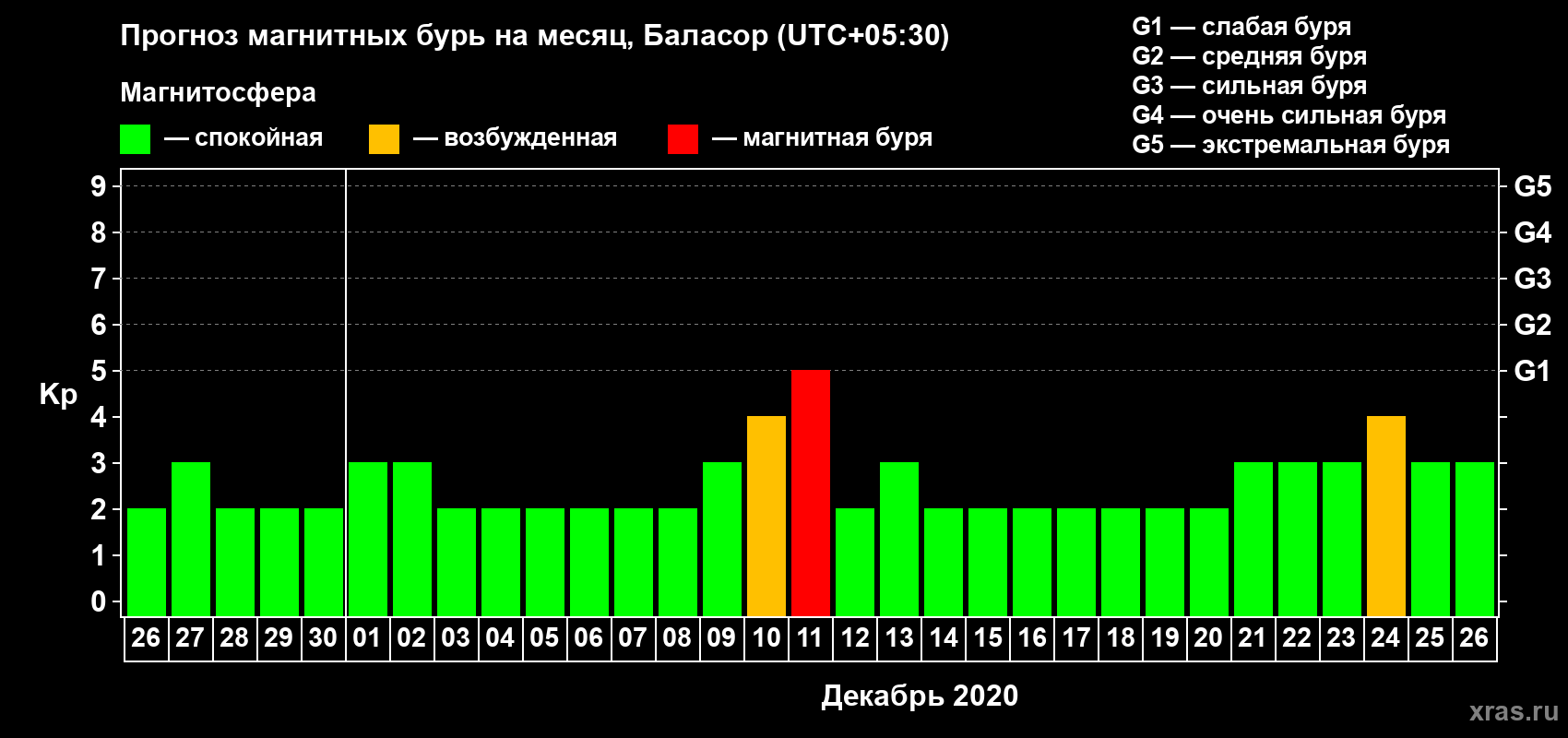 Прогноз магнитных бурь в Баласоре — 26 ноября 2020 года