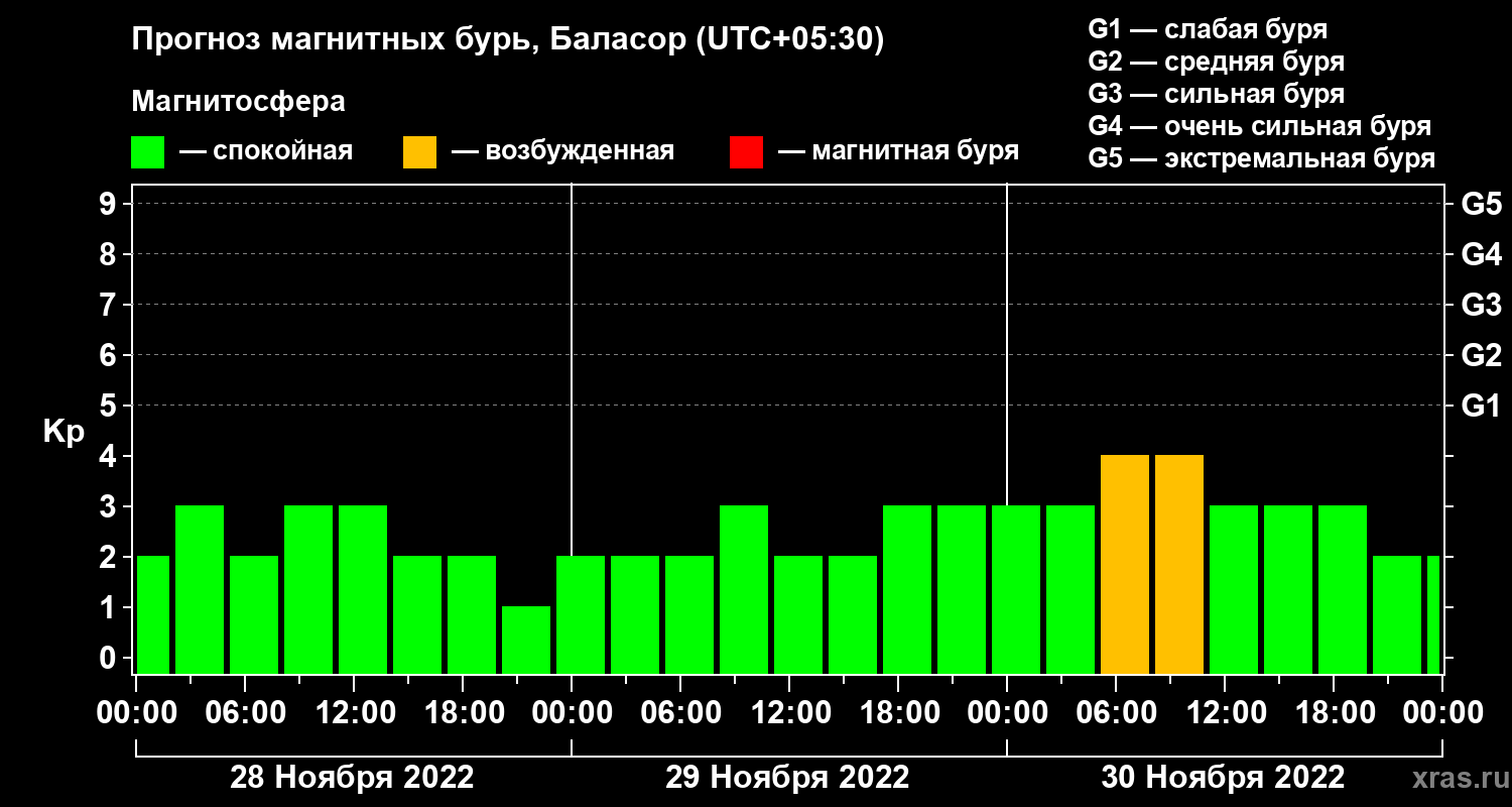 Прогноз магнитных бурь в Баласоре — 28 ноября 2022 года