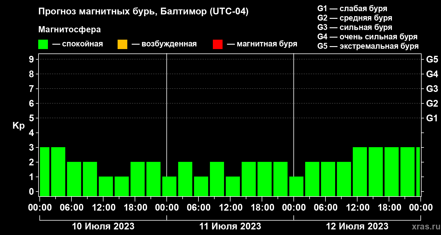 Прогноз магнитных бурь в Балтиморе на 10 июля 2023 года