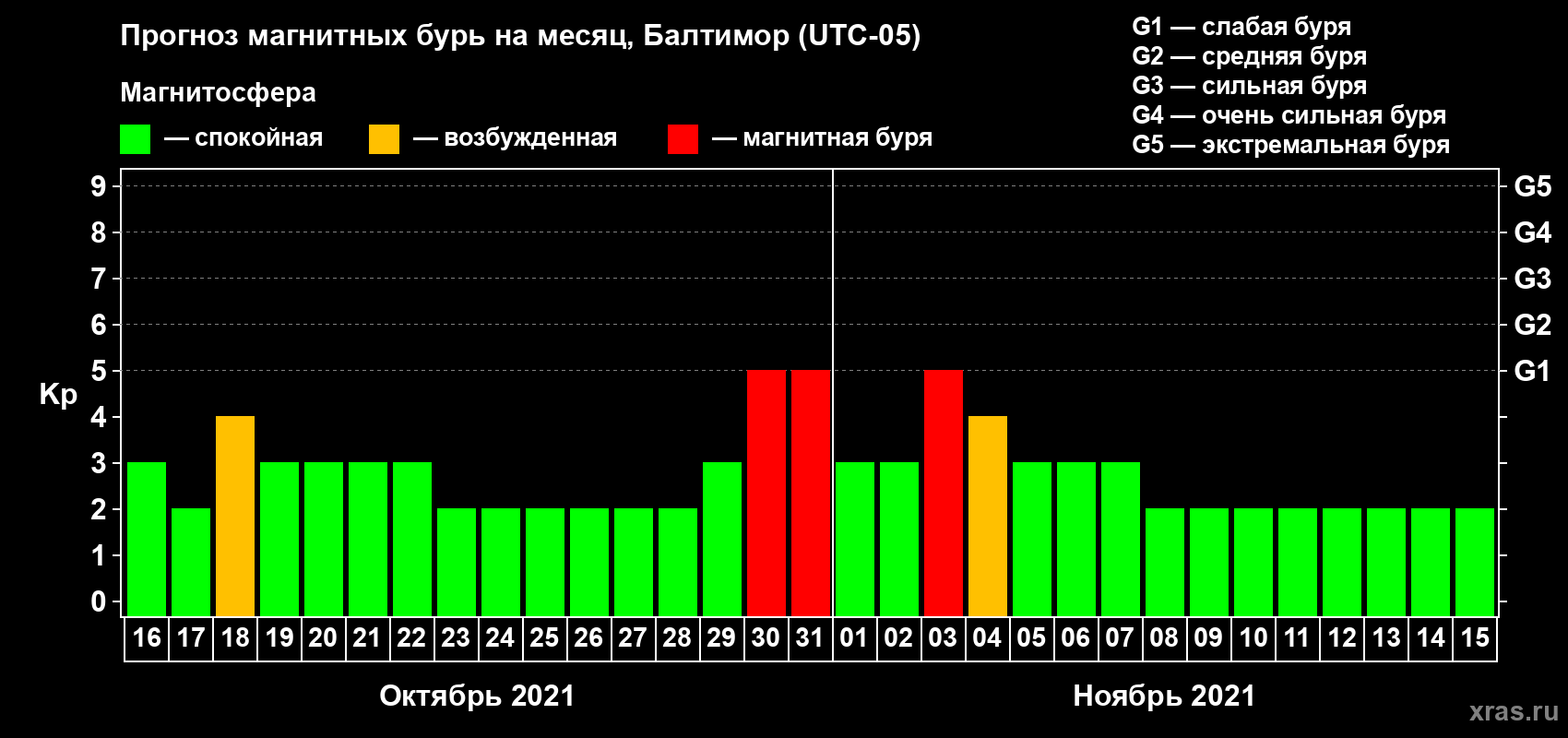 Прогноз максимального суточного геомагнитного индекса Kp на 1 месяц (31 день) с 16 октября по 15 ноября 2021 г