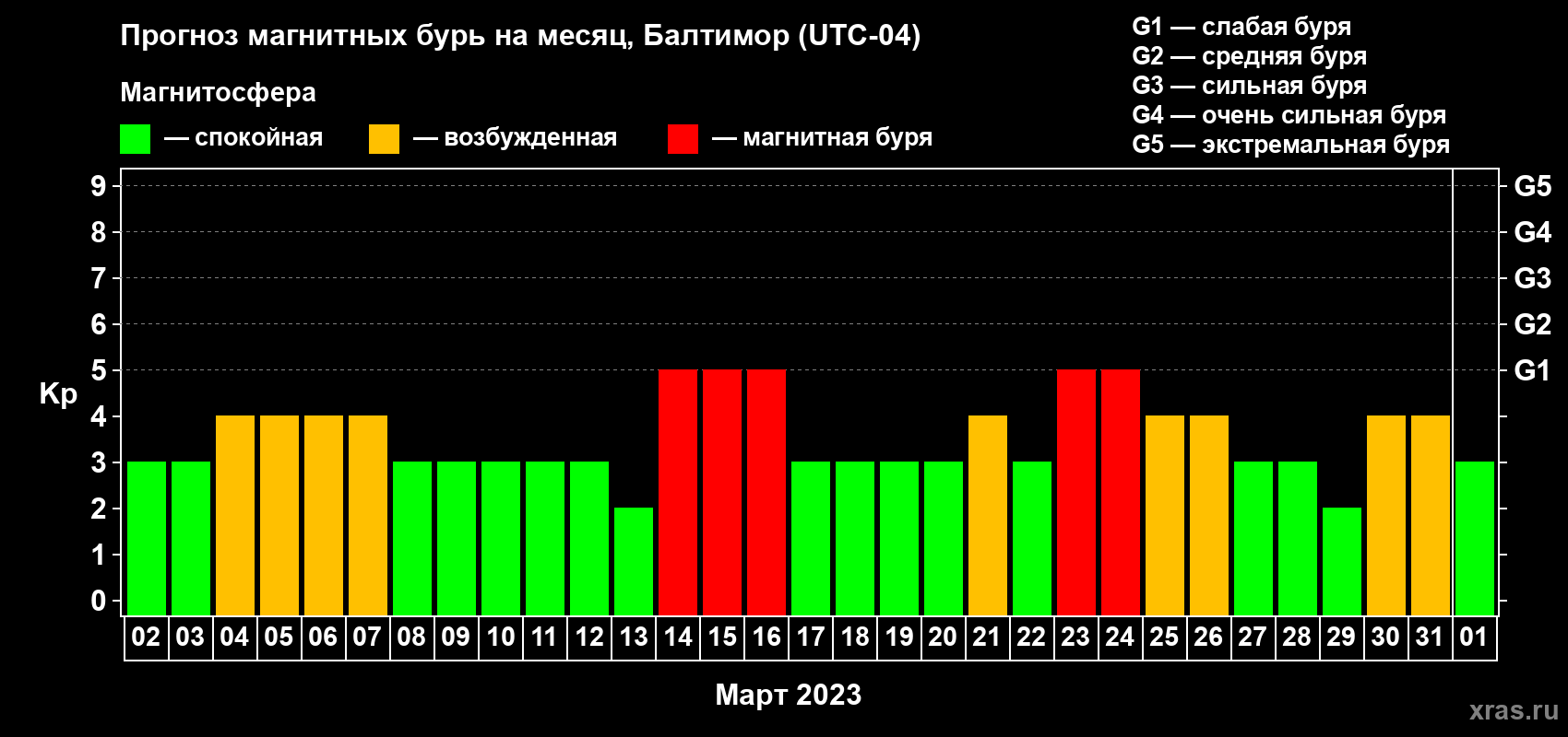 Прогноз максимального суточного геомагнитного индекса Kp на 1 месяц (31 день) с 02 марта по 01 апреля 2023 г