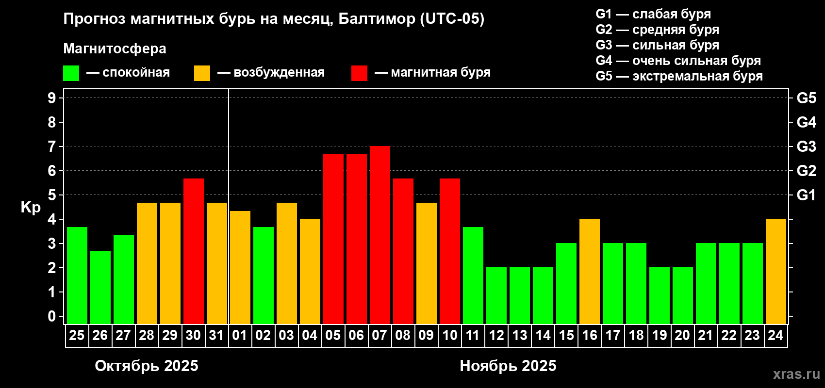 Прогноз магнитных бурь в Балтиморе на 25 октября 2025 года